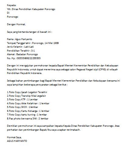 Contoh Surat Lamaran Kerja CPNS Lulusan S1 untuk Dinas ...
